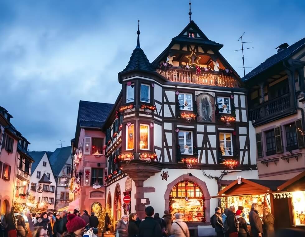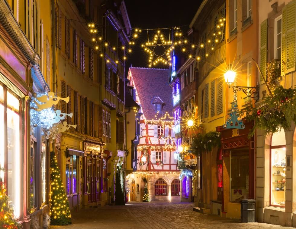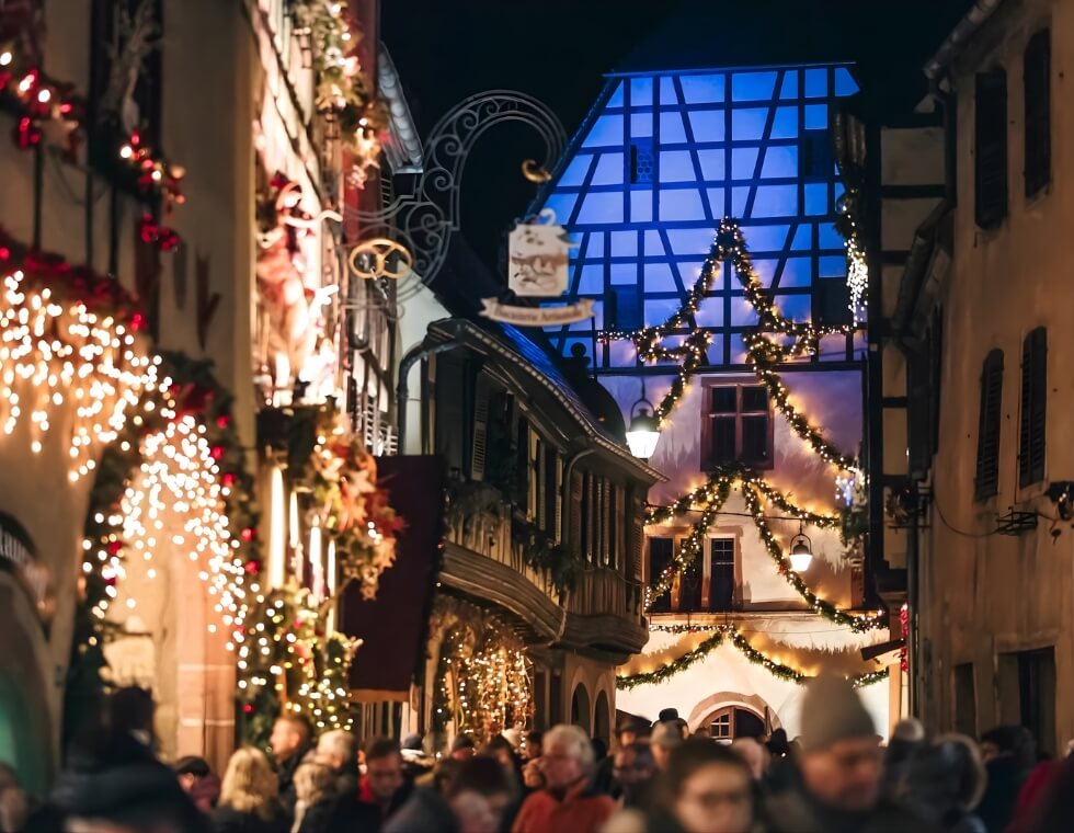 Every corner of Colmar sparkles, half-timbered houses draped in garlands, reflections of lights dancing on the canals, and the comforting smell of cinnamon in the air. Try the local bredele biscuits and a glass of Alsatian white wine while you wander.