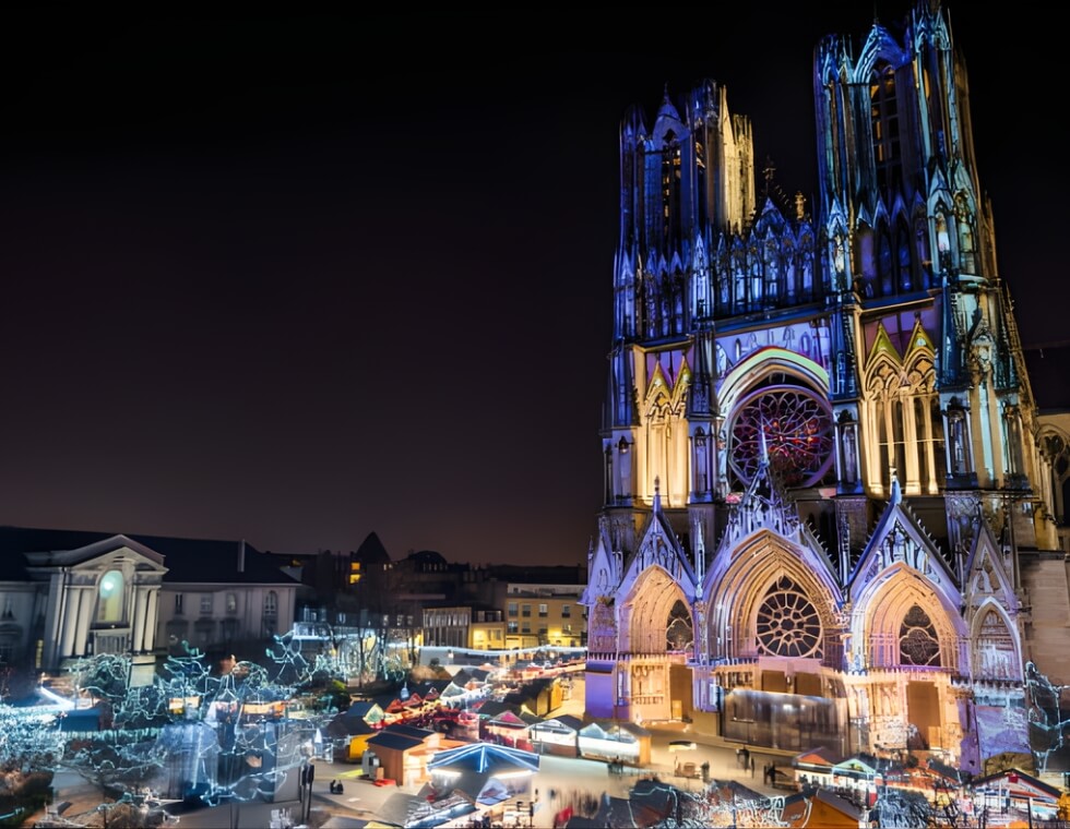 If you like a bit of sparkle (in every sense), Reims is worth the trip. The market takes place in front of the cathedral, one of the most impressive in France, and in the evenings, the façade is lit up by a stunning light show.